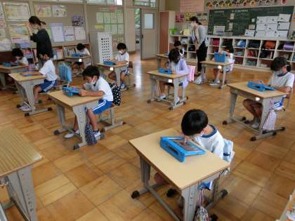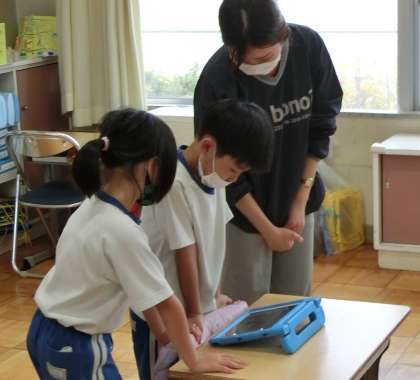 2年生はタブレットを使って、「町たんけん」で見つけたことを紹介し合うための資料作りを行いました。自分で撮影した写真を、学習アプリ「スカイメニュー」の発表ノートに貼り付け、色や大きさを工夫して文字を入力していました。