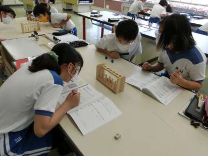 6年生が、理科「水溶液の性質」の学習で、鉄とアルミニウムを塩酸に入れて変化を見る実験を行っていました。目で見た様子をノートに記録したり、実験前と実験後の様子をタブレットで写真を撮って変化を見たりしていました。