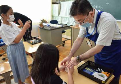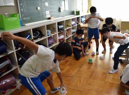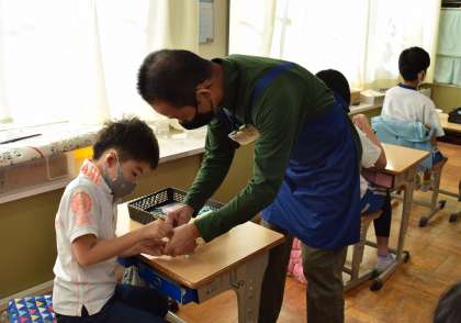 4年生が講師の先生をお迎えして、クランクの仕組みを取り入れた「輪ゴムぜんまい車」づくりを行っていました。ぴょこぴょこと飛び跳ねるような動きをする、楽しいおもちゃが作れました。