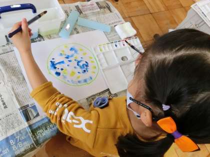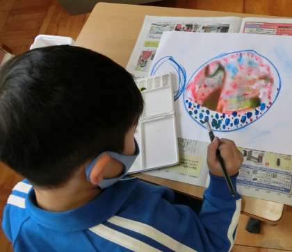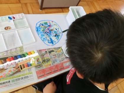 1年生が図工「おはなしの絵」の学習で、「たらし込み」という技法できれいな模様を描く練習をしていました。