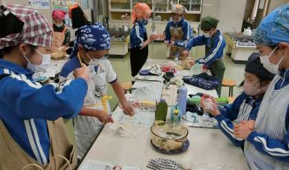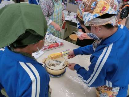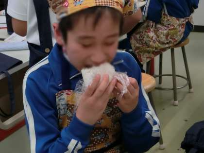 5年生が家庭科で、お鍋でご飯を炊く学習を行っていました。少しできたおこげが、炊飯器で炊いたご飯とは違う、おいしさを醸し出して絶品おにぎりとなったようです。