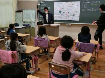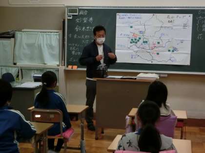4年生が、地域講師で学校アドバイザーでもいらっしゃる鈴木政彦様をお招きして、総合「花山の地名や民話について学ぼう」の学習を行いました。