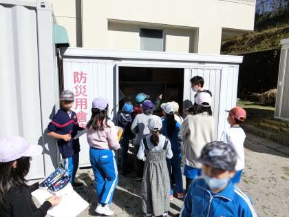 4年生が社会科「自然災害からくらしを守る 防災」の学習の一環で、本校の防災倉庫について調べていました。