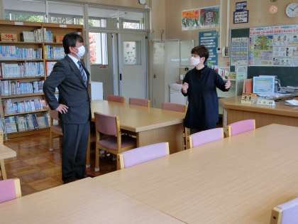 学校図書館の様子も参観され、司書さんから図書館利用の現状や問題点などを聞いてみえました。5年生教室では、書写の学習の様子を参観されました。