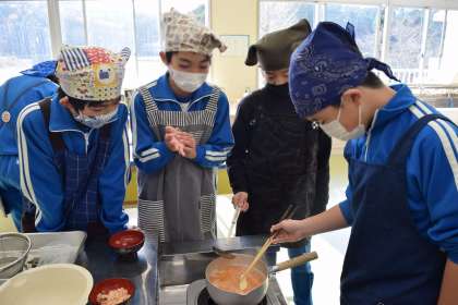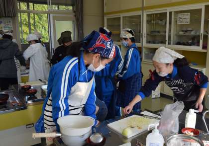 6年生が調理実習で、「じゃがいもハンバーグ」「わかめスープ」「やきそば」作りを行いました。おいしそうなにおい香りが学校中に広がっていました。