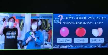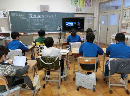 6年生が、「GIGAスクール特別講座〜教室から深海探査につながろう!〜」に参加しました。深海無人探査船「ハイパードルフィン」とリアルタイムでつながり、深海の海底の様子を見たり、クイズに参加したりしました。