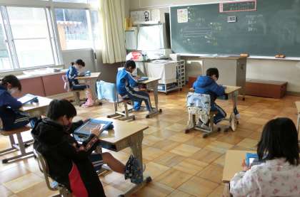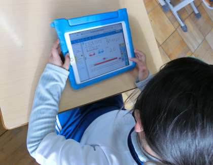図を使って考える問題に挑戦していました。 タブレットを使って、考え方を伝え合いました。