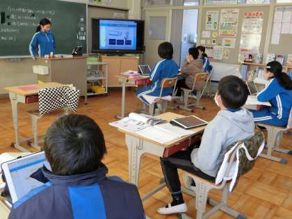 2月9日、6年生が理科の授業で、自動で動く電気製品に仕組まれているプログラミングについて考え、図式化したものを見せながら発表していました。