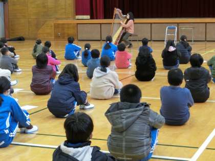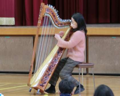 今日の全校集会では、塚田先生が、ハープの仲間で民族楽器『アルパ』を演奏してくださいました。曲目は、「春よ来い」。卒業を間近に控えた6年生や9年間お勤めいただいた伊藤さんに、素敵な春が訪れますように・・・という願いを込めての演奏でした。