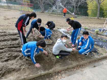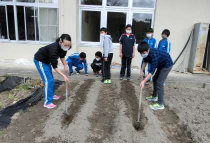 来年度の6年生の学習のために、6年生が畑にジャガイモを植えてくれました。