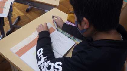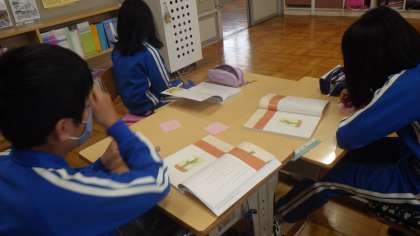 6年生が国語の学習で「サボテンの花」のミニ朗読発表会を行いました。お話の中から自分の好きな部分を選び、それぞれ工夫して読み上げました。最後は、グループの子の感想を書き合い、自分の朗読を振り返ることができました。
