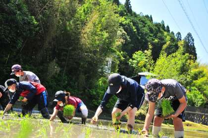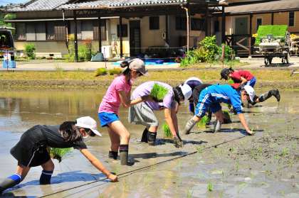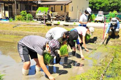 5年生が、学校アドバイザーで地域講師でもある浅見さんの田んぼで「田植え体験」を行いました。