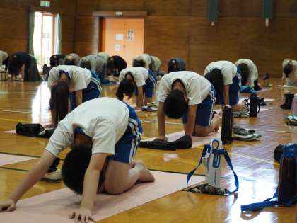 24日(金)の3・4時間目に行われた学校保健委員会では、「快腸快便」について学び、快便を促す効果のあるヨガを体験しました。