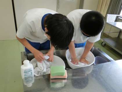 6年生が家庭科「夏を涼しくさわやかに」の学習の一環で、手洗いによる洗濯に挑戦しました。