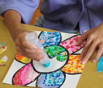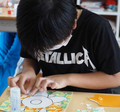 花山っ子小全員で下山支所の新しい壁画を作成しています。折り紙をちぎって、オリジナルの花を作っています。