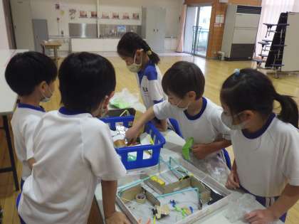 11月30日(水)の5時間目に、1年生が2年生を招待して、秋のテーマパークを開きました。お店屋さんになった1年生もお客さんになった2年生も、楽しんでいました。