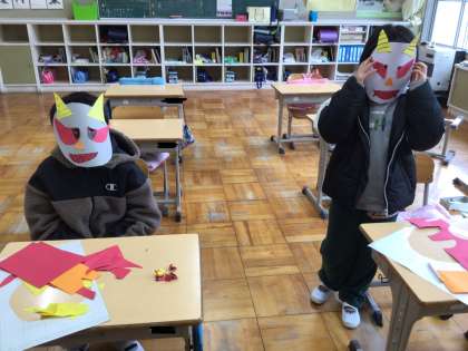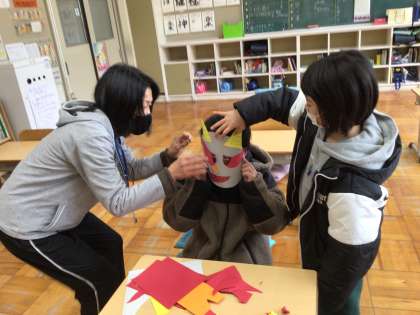 鬼のお面を作り、新聞紙でつくった豆をまきました。