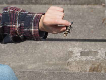 生き物のすみかをよく知っていてすぐにトカゲを見つけたり、バニちゃんの大きさを帽子と比べて分かりやすく写真を撮ったりしました。