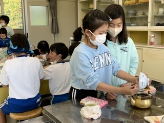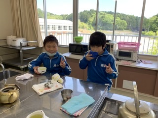 5年生の家庭科で、安全なガスコンロの使い方を学習しました。やかんでお湯を沸かし、お茶をいれました。緑茶とほうじ茶の2種類の香りや味を楽しみました。安全に気をつけて学習することができました。