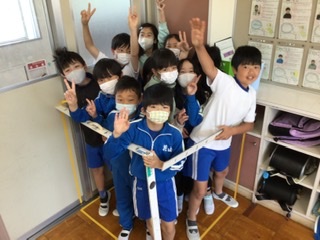 算数の体積の学習で、体積の単位の関係について学びました。実際の大きさを見たり体感したりしながら学習しました。上の写真は、1㎥の立方体を作って、何人入れるか体感したときの写真です。