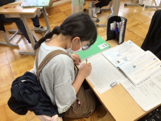 国語では、それぞれが調べた環境問題の原因や対策について報告文にまとめています。報告文を書く時は、読み手に問いかける言葉を使うとよいことに気づきました。2時間で書く予定ですが、1時間目のうちに原稿用紙が足りなくなって2枚目に突入する子もいます。