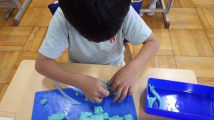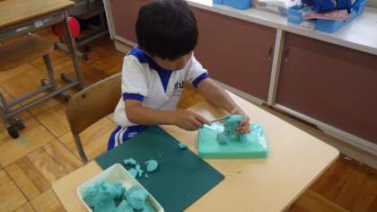 1年生が図工の学習で、ねんどあそびに挑戦しました。新しいねんどは、硬くてカチカチ。ちぎったりにぎったり、ねじったり丸めたりと、いろいろな形に変えながら、ねんどをほぐしていきました。