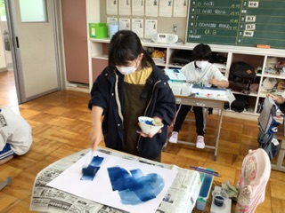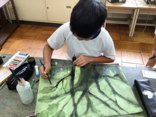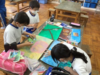 好きな風景や動物の写真を選び、写真の外側にはどんな世界が広がっているのかを想像してかいています。絵の具の色をたくさん重ねてみると、奥深い作品ができました。また、暗い色を背景に選んだ子はキラキラのラメやビーズを付けて立体感のある作品ができました。