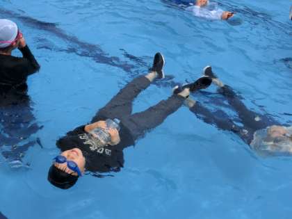 浮いて待つときの注意点をしっかり聞いて、助かるためのラッコ浮きに挑戦しました。