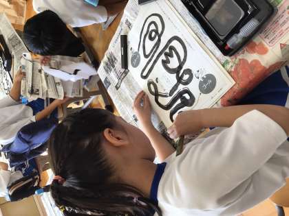 夏休み明け、久しぶりの書写でした。姿勢や筆の持ち方に気を付けて、直線や曲線なぞりをしました。また「日」の2画目(おれ)の練習をしました。集中した真剣な姿が立派でした。