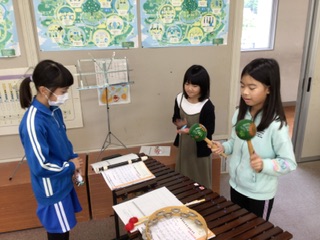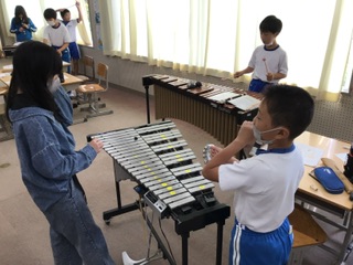 いろいろな楽器のリズムや音階を楽しみながら演奏しています。グループを作り、楽器の音を重ねながら演奏会に向けて練習しています。