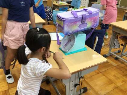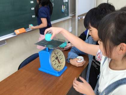 算数の学習で、重さについて勉強しています。500gの粘土を作ってみよう、いろいろなものが何gか予想してからはかろう、など手でもった重さの感覚を養っています。