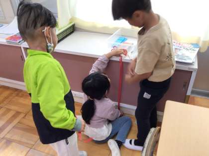 算数の学習で、紙テープを使って、教室中の者の高さを調べました。3人で協力して、テレビ台やロッカー、タブレット保管庫などの高さを測ることができました。