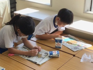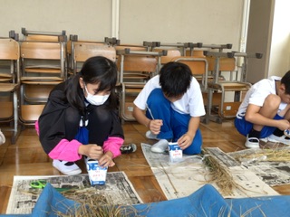 春からバケツで育てた稲の収穫を行い、今日は脱穀を行いました。牛乳パックをうまく活用して、お米を収穫しました。