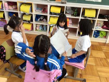 国語の学習で、サラダで元気に出てくるりっちゃんへ、おすすめの元気が出る食べ物を手紙に書いて教えてあげました。この日は、どんな手紙を書いたのか友達の手紙をグループで読み合いました。梅干しや豚肉、うましおドレッシングなど、たくさんの食べ物をりっちゃんにおすすめすることができました。