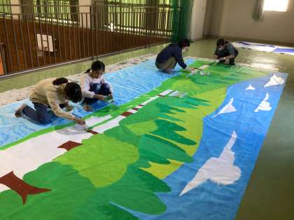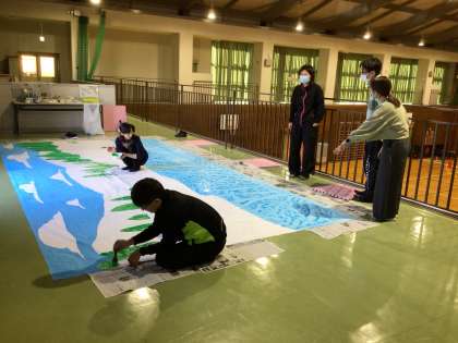 「お魚」と「魚の骨」の絵、「大きな背景画」等を、たった2日間で描きあげてくださいました。背景画ボランティアの皆様方、お忙しい中のご参加ありがとうございました。