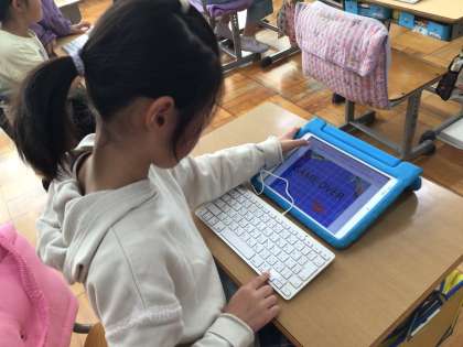 ICT支援員と一緒にタブレット学習を行いました。3年生は、プログラミングのゲームを作成しました。「消しゴムから連続して鉛筆を飛ばすには、どの命令が必要かな」と一生懸命に考え、頭の中で想像している動きをゲームの中で再現することができました。