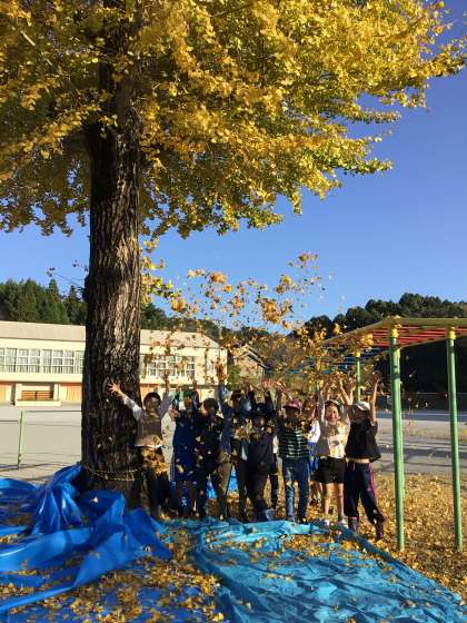花山小学校のシンボルである、いちょうがとてもきれいです。いちょうのシャワーがすごくきれいで夢中になって遊びました。楽しかったですね。
