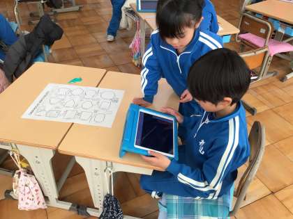 1日(木)の5時間目にこども園の年長さんと1年生で交流会を開きました。来年度の新1年生のために、1年生の行事の紹介をする「思い出すごろく」「学校クイズ」「メッセージメダルとプレゼント」の準備を行いました。当日、新1年生がとっても喜んでくれて、交流会は大成功でした。