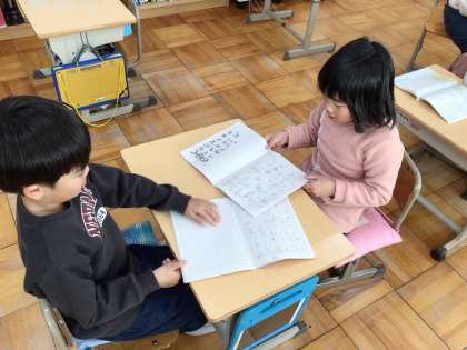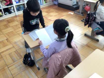 26日(月)に国語科「ことばをあつめよう」の学習で、文作りを行いました。教科書に載っている言葉を4つをつなげて、一つの文を作ります。「大きいトマトをどんどんたべる」「かたいとびらをどんどんたたく」など、たくさんの文ができあがりました。作った文をペアで交流します。「友達と似ている文ができたよ」「たくさん文が作れたよ」「もっと作りたかった!」と子どもたちは満足げな様子です。