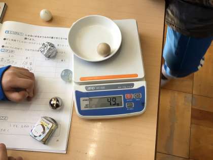 「同じ体積のものは、同じ重さなのか」を調べるために、5種類の球の重さ比べをしました。鉄球がだんとつで重たく、「同じ体積のものでも、種類によって重さが違う」という結果が分かりました。どの班も、正確に測ることができました。