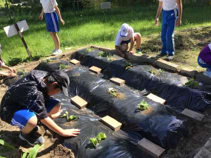 さつまいもを植えました。公務手さんが、耕運機で土を耕し、マルチをはってくださり、植え方のコツも教えてくださいました!秋の収穫が楽しみですね。