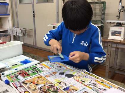 図工で、「〇〇のときの気持ちを模様・形・色を工夫して表現しよう」と心のもようを描きました。金あみと歯ブラシを使いで青い絵の具を塗布し、悲しい気持ちを雨に例え表現するなど、それぞれの工夫が見られました。
