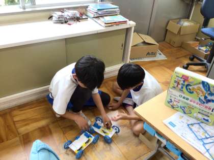 6月6日(木)に、理科の学習を生かして、モーターカーを作りました。電流が流れる回路を試行錯誤しながら作り、みんなで動かして遊びました。