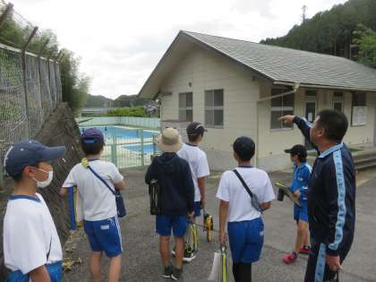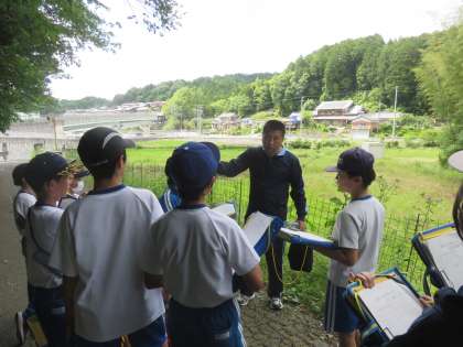 総合的な学習の時間で、花山小学校の校歌にある「たんれんコース」について考えています。6月4日(火)には、PTA会長の伊藤様をお呼びして、花山小学校の歴史や、以前のたんれんコースについてお話をしていただきました。測定器を使って、コースの距離を実際に測ったり、今では通れなくなっている道などを確かめたりして、たいへん有意義な時間となりました。この学習は、特色ある学校づくり推進事業として行っています。
