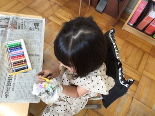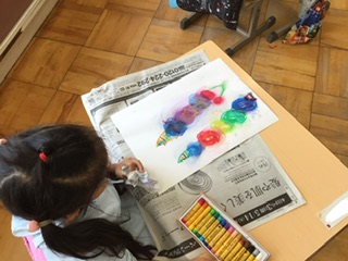 クレヨンを使って、こすって広げて作品を作りました。いろいろな色を重ねたり、こする方向を変えたり、工夫しながら楽しみました。学習の終わりの片付けや掃除も、どの子も丁寧に頑張る姿が素敵です。