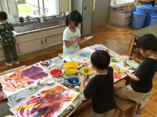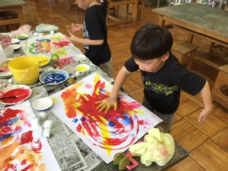 色々な道具に絵の具をつけて、コロコロしたりスタンプのように押したりして楽しみました。初めての絵の具を使った学習ですが、とても楽しく活動することができました。