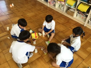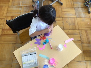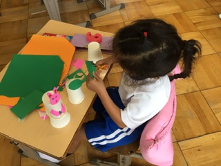 紙コップと輪ゴムを使って、とぶ仕組みを考え、作品を作りました。画用紙や折り紙の切れ端を見つけると「あ、これはウサギの耳に見えてきた」など、楽しく活動しました。