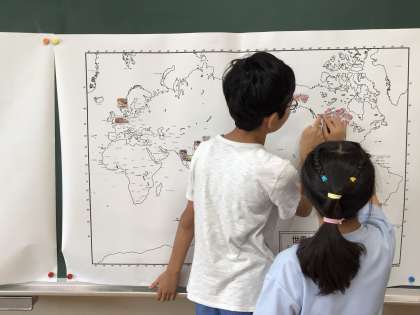 社会の学習で、わたしたちがふだん食べている食料品はどこから来ているのか?と疑問をもち、スーパーのチラシを切り、地図に貼りました。貼りながら「愛知県たくさん貼られてる」「チリ多いな〜」「オレンジ2つ目だ!」など、気付くことがたくさんありました。これをもとに、農作物・畜産物・水産物についてもっと調べていこうと思います。
