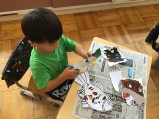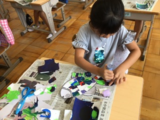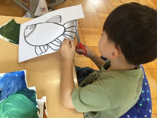 画用紙いっぱいに絵の具を塗り広げ、好きな形に切って、魚のうろこを作りました。絵の具の使い方はもちろん、はさみの使い方や水のりの使い方も復習することができました。
