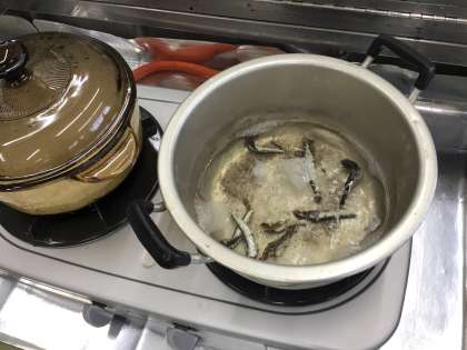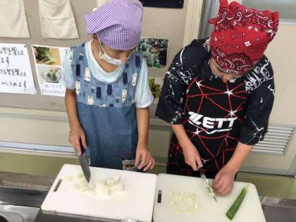 お米がご飯になるまでの過程を勉強するために、ガラス鍋を使ってご飯を炊きました。炊き上がると「量が増えてる!?」と驚いていました。また、出汁のうまみを感じるために、煮干しで出汁をとり、みそ汁を作りました。部屋に広がる煮干しのいい香りを感じながら、手際よくみそ汁を作り、大満足の調理実習となりました。